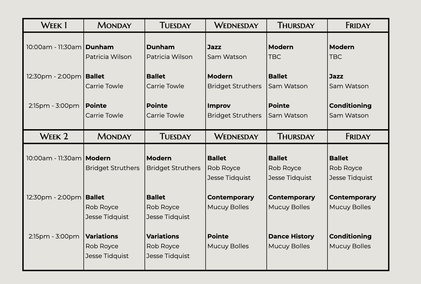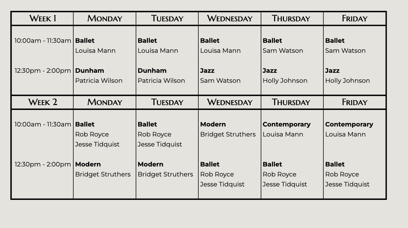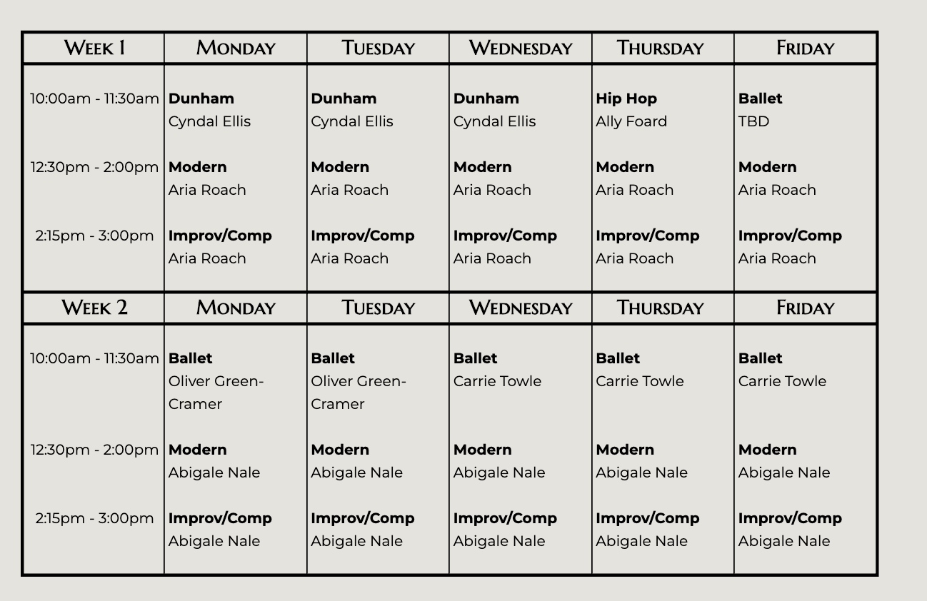 A comprehensive two-week program offering both Level I and Level II tracks. Dancers build strong technical foundations through daily ballet while exploring a range of styles including modern, jazz, Dunham, and contemporary. Level II dancers benefit from an expanded schedule with additional classes in pointe, variations, conditioning, and improvisation, providing a well-rounded and immersive training experience. Guest teachers for this intensive include Samantha Watson, Rob Royce, and Jesse Tidquist.
