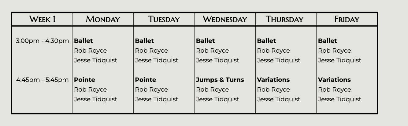 A focused, one-week intensive for intermediate and advanced dancers centered on strengthening classical ballet technique. Daily ballet classes are complemented by targeted training in pointe, jumps and turns, and variations, making this an ideal program for dancers looking to refine precision, strength, and performance skills in a short, concentrated format. This intensive is led exclusively by guest artists Rob Royce and Jesse Tidquist.
